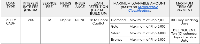 Commodity > Ito ay ay loan para sa pag-purchase ng mga pangunahing needs gaya ng rice, groceries at feeds > goods ang nakukuha dito at hindi cash > ang loanable amount ay naka base sa membership classification > ito ay dapat bayaran sa loob ng 30 ...